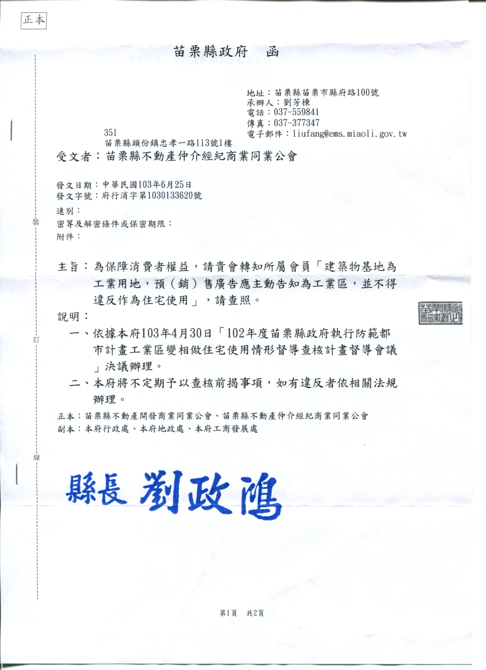 縣政府公告為保障消費者權益,「建築物基地為工業用地,預(銷)售廣告應主動告知為工業區,並不得違反作為住宅使用」,敬請各所屬會員知悉。