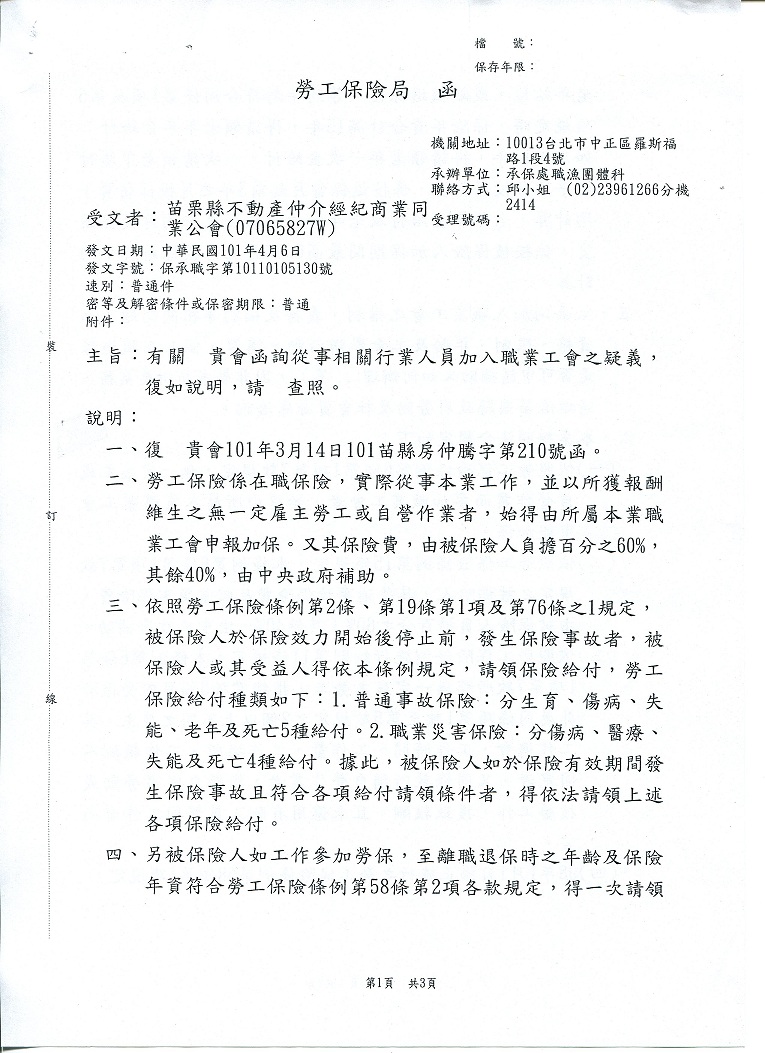 » 關於日前本會向行政院勞工委員會詢問有關從業人員加入職業工