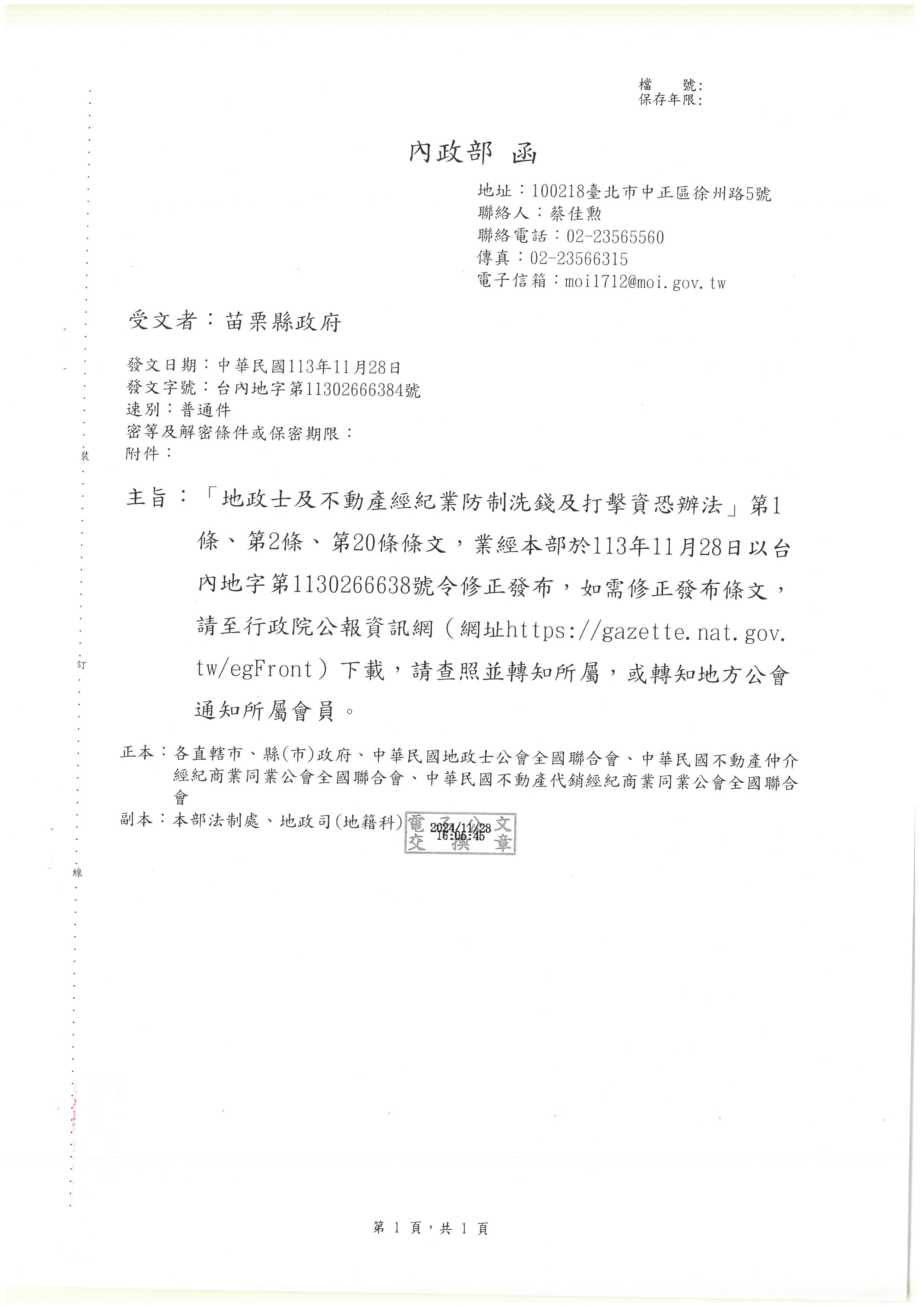 檔案下載(有關「地政士及不動產經紀業防制洗錢及打擊資恐辦法」第1條、第2條、第20條條文,業經內政部於113年11月28日以台內地字第1130266638號令修正發布,如需修正發布條文,請至行政院公報資訊網(網址httpsgazette.nat.gov.twegFront)下載,並請公會協助轉知所屬會員,請查照。2-1.jpg)
