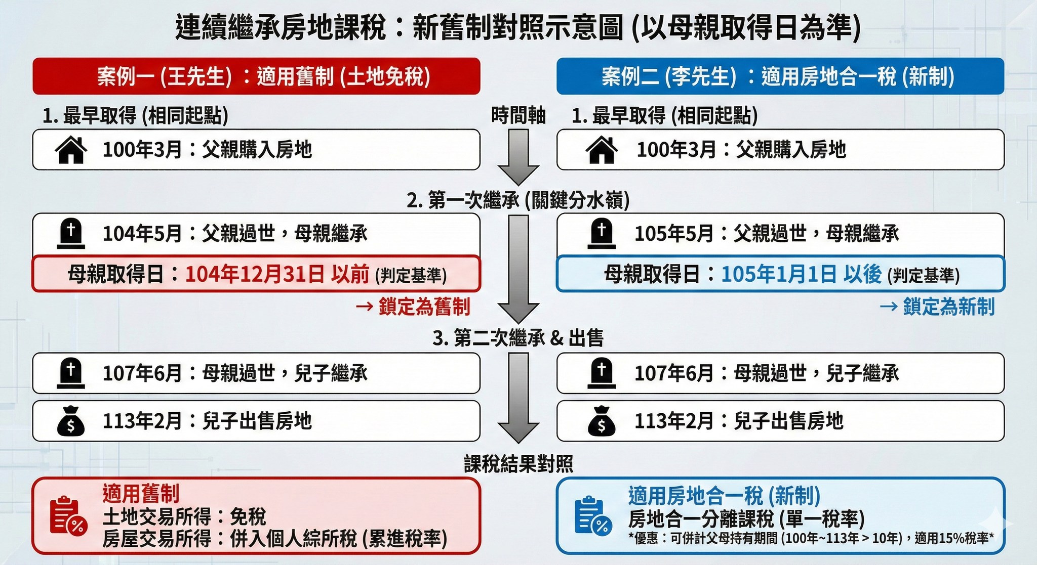 案例一:甲君之父於100年3月間購買A房地,甲父於104年5月間死亡,由甲君之母繼承取得A房地,嗣甲母於107年6月間死亡,再由甲君繼承取得A房地,並於113年2月間出售,因最近一次繼承之被繼承人甲母係於104年12月31日以前繼承取得A房地,甲君出售A房地,得適用舊制,僅就房屋財產交易所得課稅。