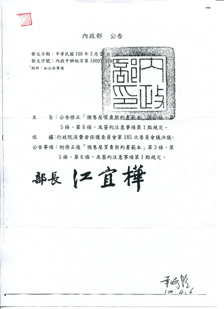 » 修正「預售屋買賣契約書範本」規定公告1份